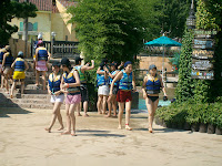Am nächsten Morgen (Sonntag d. 28.09.2008) ging es nach dem Aufstehen direkt zum Frühstück. Mh lecker mit Croissants, frischen Obst und Sonnenschein startet es sich doch angenehm in den Tag. Die Sonne schien, die Croissants waren Reis und das Obst war eingelegtes Gemüse. Es kam einen schon so vor, als ob wir das Abendessen vom Vortag nicht aufgegessen hatten und es so noch einmal zum Frühstück präsentiert bekamen. Da lacht das Herz und der Magen dreht sich in alle Richtungen. Also haben wir ein Zeitlimit von 45min bekommen um uns etwas essbares in der Stadt zu suchen. Ich habe mich für ein Sandwich und Saft entschieden. Zu spät ging es dann in eine Papierwerkstatt. Dort haben wir eine Holzbox künstlerisch mit Papier beklebt. Laut den Worten der Damen, die uns geholfen haben, ist so eine Federtasche aus Holz entstanden. Wie auch immer. Danach haben wir selber Papier hergestellt. Und schon war auch der Vormittag vergangen. Zeit für ein ordentliches Mittagessen. Dieses war dann doch etwas "abwechslungsreicher". Es gab Bibimbap (eigentlich gar nicht so schlecht) mit den Beilagen, die wir schon 3x hatten (natürlich neu zubereitet). Der Magen war nun nicht mehr halb leer, sondern halb voll. In diesem Zustand ging es zum Höhepunkt des Sonntags, eine traditionelle Hochzeit. Es war aber keine reale, sondern nur eine von uns nachgespielte. Interessanterweise kennt der Bräutigam seine angetraute Frau vor der Hochzeit nicht und sieht sie somit zum ersten Mal. Der Rest bestand aus verschiedenen Bräuchen, wie zum Beispiel die Übergabe einer Plastikente (die im Ernstfall die andere Person suchen soll) und das tragen bunter Kostüme. Anschließend haben wir alle noch eine halbe Stunde Trommelunterricht bekommen und sind dann wieder zurück nach Seoul gefahren.